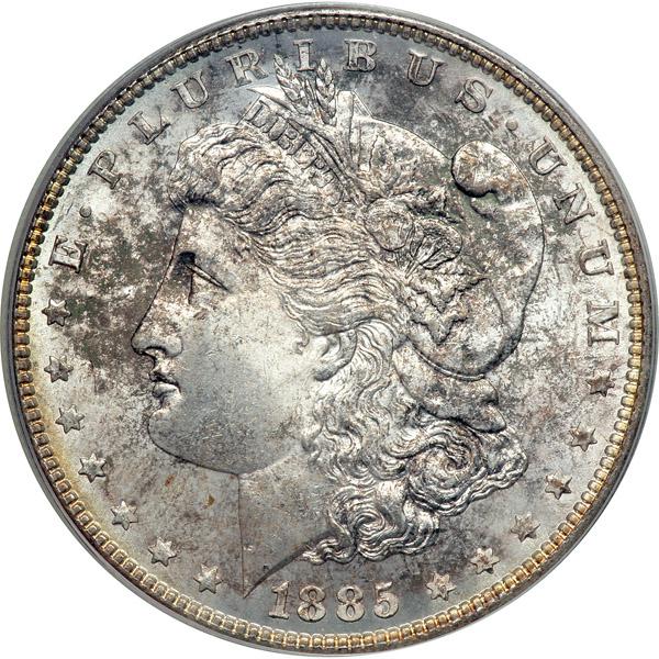 1885 Morgan Dollar. PCGS graded MS-66. Well struck with light mottled toning on the obverse. The surface dancing with luster underneath (PCGS # 7158) .
