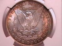 1885 Morgan Dollar MS63 NGC Color Coin. Obverse toned in grays, gold, green and blue. The reverse is brilliant in the center with an orange and blue-green halo around the rims.