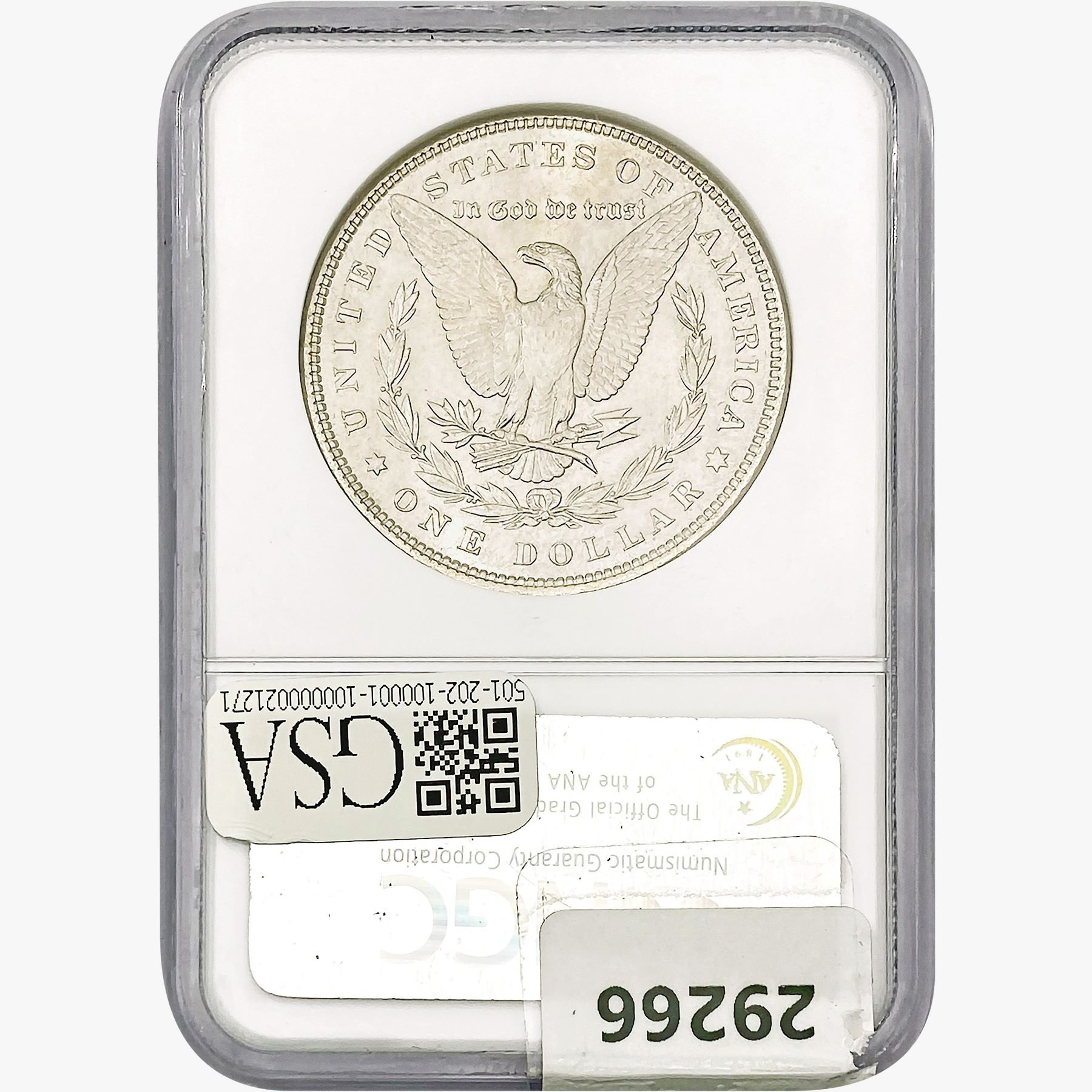 e. Coins sold referencing a third-party grading service are sold “AS IS” without any express or implied warranty, except for a guarantee by GSA that they are genuine. Removal or alteration of the holder, voids all of Bidder’s claims concerning that Product. Certain warranties may be available from the grading services and Bidders are referred to them for further details: Numismatic Guaranty Corporation (NGC), PO Box 4776, Sarasota, FL 34230, www.ngccoin.com/services/writtenguarantee.asp; Professional Coin Grading Services (PCGS), PO Box 9458, Newport Beach, CA 92658, www.pcgs.com/guarantee.html; ANACS, 6555 S. Kenton St., Ste. 303, Englewood, CO 80111; and Independent Coin Grading Co. (ICG), 7901 East Bellview, Ave., Suite 50, Englewood, CO 80111.