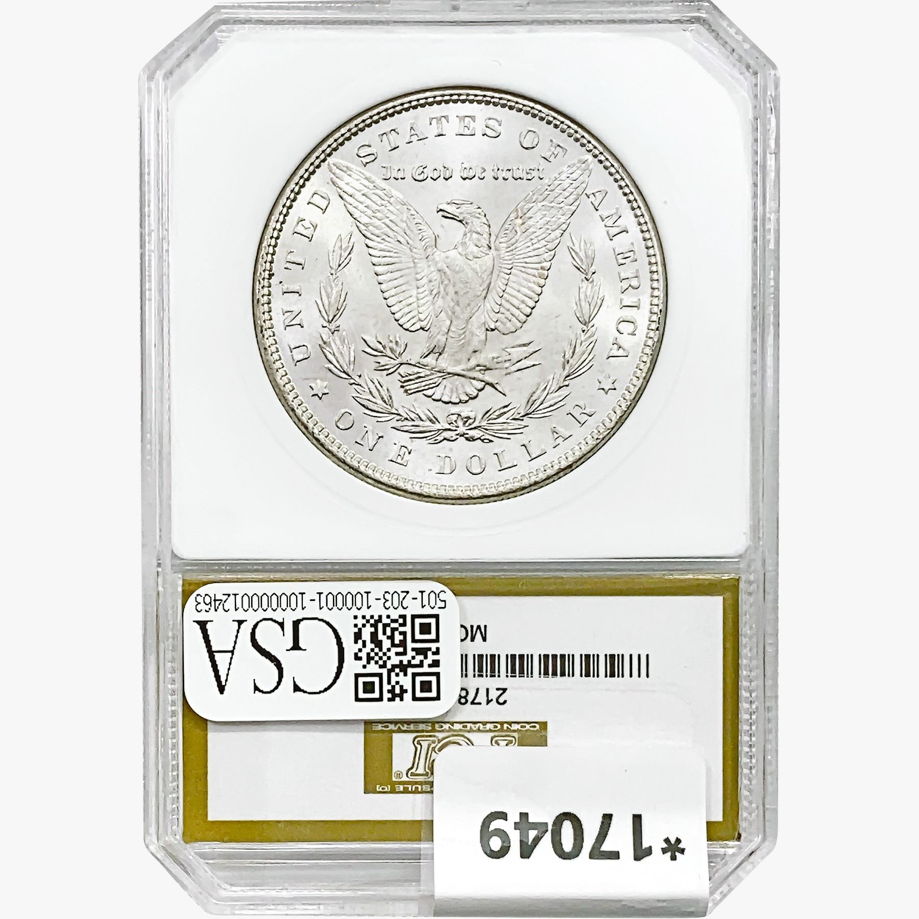 COINS AND CURRENCY LISTED IN GSA’S CATALOG AS GRADED AND ENCAPSULATED BY PCGS, NGC, ANACS, ICG, PCGS CURRENCY, PMG, PCGS BANKNOTE GRADING, CMC OR ANY OTHER THIRD-PARTY GRADING SERVICE ARE LIKEWISE SOLD “AS-IS” EXCEPT AS EXPRESSLY SET FORTH HEREIN. ALL THIRD-PARTY GRADING SERVICE GUARANTEES, INCLUDING AUTHENTICITY, ARE THE SOLE RESPONSIBILITY OF THE THIRD-PARTY GRADING SERVICE AND NOT WARRANTIES OR GUARANTEES OF GSA. BIDDERS SHOULD CONTACT THESE THIRD-PARTY GRADING SERVICES DIRECTLY WITH RESPECT TO ANY CLAIMS OR QUESTIONS THEY MAY HAVE CONCERNING THEIR GUARANTEES AND WARRANTIES. BIDDERS ACKNOWLEDGE AND AGREE THAT AUCTIONEER IS NOT BOUND BY OR LIABLE FOR ANY OPINION OR CERTIFICATION BY ANY THIRD-PARTY GRADING SERVICE. REMOVAL OF A PRODUCT FROM ITS PROTECTIVE CASING OR HOLDER OR ALTERATION OF ANY COIN HOLDER WAIVES ALL RIGHTS CONCERNING THE PRODUCT CONTAINED THEREIN.