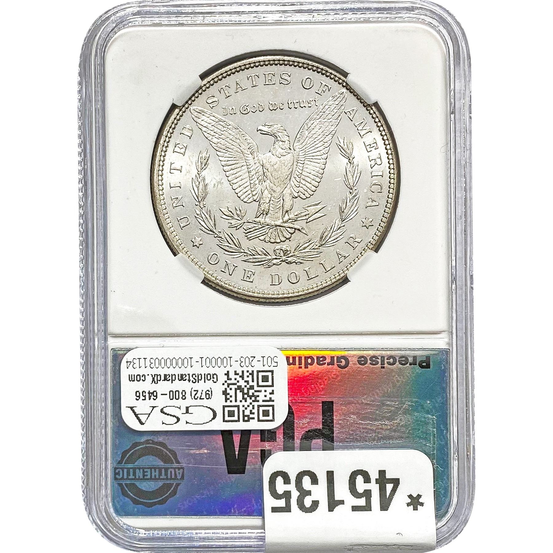 COINS AND CURRENCY LISTED IN GSA’S CATALOG AS GRADED AND ENCAPSULATED BY PCGS, NGC, ANACS, ICG, PCGS CURRENCY, PMG, PCGS BANKNOTE GRADING, CMC OR ANY OTHER THIRD-PARTY GRADING SERVICE ARE LIKEWISE SOLD “AS-IS” EXCEPT AS EXPRESSLY SET FORTH HEREIN. ALL THIRD-PARTY GRADING SERVICE GUARANTEES, INCLUDING AUTHENTICITY, ARE THE SOLE RESPONSIBILITY OF THE THIRD-PARTY GRADING SERVICE AND NOT WARRANTIES OR GUARANTEES OF GSA. BIDDERS SHOULD CONTACT THESE THIRD-PARTY GRADING SERVICES DIRECTLY WITH RESPECT TO ANY CLAIMS OR QUESTIONS THEY MAY HAVE CONCERNING THEIR GUARANTEES AND WARRANTIES. BIDDERS ACKNOWLEDGE AND AGREE THAT AUCTIONEER IS NOT BOUND BY OR LIABLE FOR ANY OPINION OR CERTIFICATION BY ANY THIRD-PARTY GRADING SERVICE. REMOVAL OF A PRODUCT FROM ITS PROTECTIVE CASING OR HOLDER OR ALTERATION OF ANY COIN HOLDER WAIVES ALL RIGHTS CONCERNING THE PRODUCT CONTAINED THEREIN.