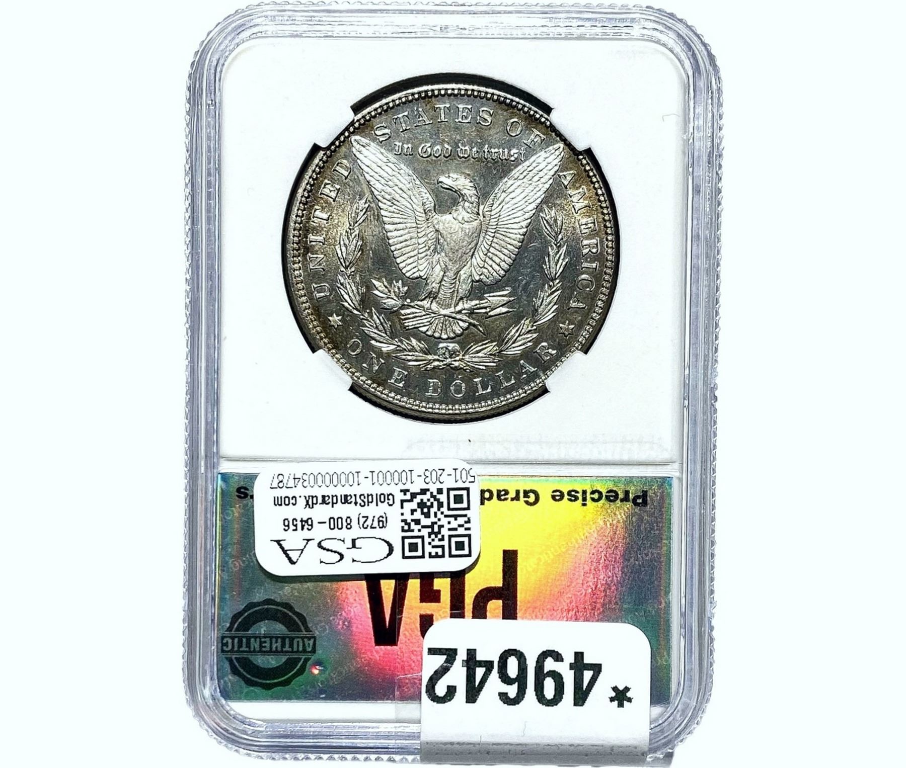 e. Coins sold referencing a third-party grading service are sold “AS IS” without any express or implied warranty, except for a guarantee by GSA that they are genuine. Removal or alteration of the holder, voids all of Bidder’s claims concerning that Product. Certain warranties may be available from the grading services and Bidders are referred to them for further details: Numismatic Guaranty Corporation (NGC), PO Box 4776, Sarasota, FL 34230, www.ngccoin.com/services/writtenguarantee.asp; Professional Coin Grading Services (PCGS), PO Box 9458, Newport Beach, CA 92658, www.pcgs.com/guarantee.html; ANACS, 6555 S. Kenton St., Ste. 303, Englewood, CO 80111; and Independent Coin Grading Co. (ICG), 7901 East Bellview, Ave., Suite 50, Englewood, CO 80111.