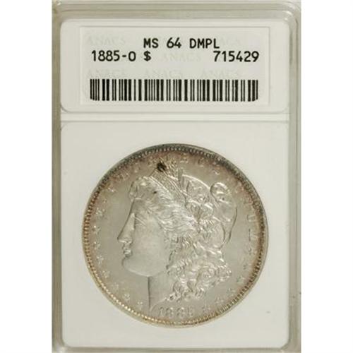 <B>1885-O $1 MS64 Deep Mirror Prooflike ANACS.</B></I> NGC Census: (439/155). PCGS Population (516/234). Numismedia Wsl. Price for NGC/PCGS coin in MS64: $260. (#97163)<BR><BR><b>Shipping:</b> Coins & Currency (<a target="_blank" href="http://www.heritageauctions.com/common/shipping.php">view shipping information</a>)