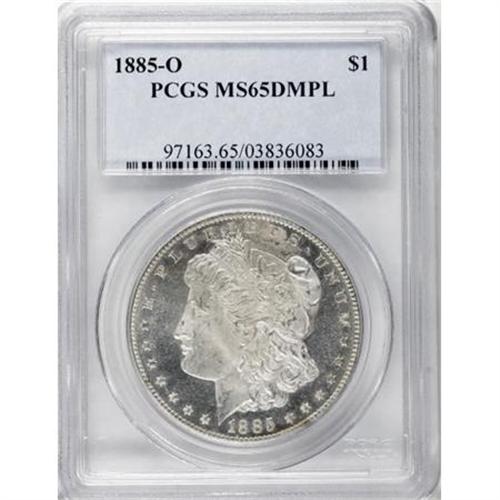<B>1885-O $1 MS65 Deep Mirror Prooflike PCGS.</B></I> PCGS Population (203/35). NGC Census: (140/16). Numismedia Wsl. Price for NGC/PCGS coin in MS65: $700. (#97163)<BR><BR><b>Shipping:</b> Coins & Currency (<a target="_blank" href="http://www.heritageauctions.com/common/shipping.php">view shipping information</a>)