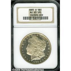 <B>1885-O<img border='0' src='http://www.heritagecoins.com/images/star.gif' width=10 height=10>$1 MS65 Deep Mirror Prooflike NGC.</B></I> Nearly untoned, save for hints of light peripheral color. The design elements are sharply struck, save for the hair over Liberty's head.