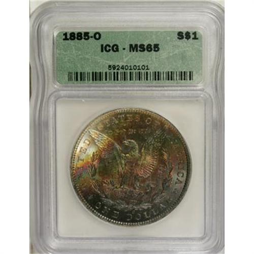 <B>1885-O $1 MS65 ICG.</B></I> NGC Census: (20562/3691). PCGS Population (14580/1992). Mintage: 9,185,000. Numismedia Wsl. Price for NGC/PCGS coin in MS65: $122. (#7162)<BR><BR><b>Shipping:</b> Coins & Currency (<a target="_blank" href="http://www.heritageauctions.com/common/shipping.php">view shipping information</a>)