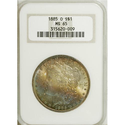 <B>1885-O $1 MS65 NGC.</B></I> NGC Census: (20309/3656). PCGS Population (14586/1992). Mintage: 9,185,000. Numismedia Wsl. Price for NGC/PCGS coin in MS65: $123. (#7162)<BR><BR><b>Shipping:</b> Coins & Currency (<a target="_blank" href="http://www.heritageauctions.com/common/shipping.php">view shipping information</a>)