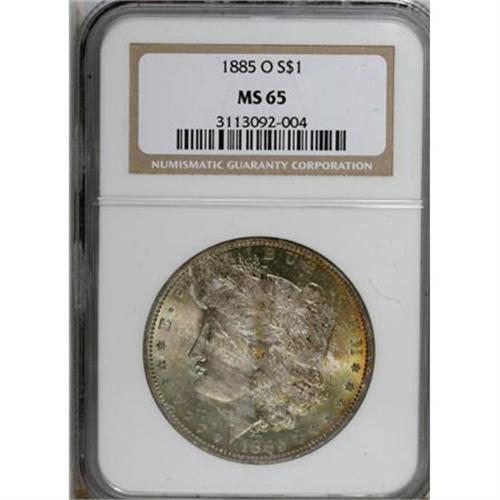 <B>1885-O $1 MS65 NGC.</B></I> NGC Census: (20700/3716). PCGS Population (14771/2036). Mintage: 9,185,000. Numismedia Wsl. Price for NGC/PCGS coin in MS65: $117. (#7162)<BR><BR><B>Coin Engraver:</B> George T. Morgan<BR><BR><b>Shipping:</b> Coins & Currency (<a target="_blank" href="http://www.heritageauctions.com/common/shipping.php">view shipping information</a>)