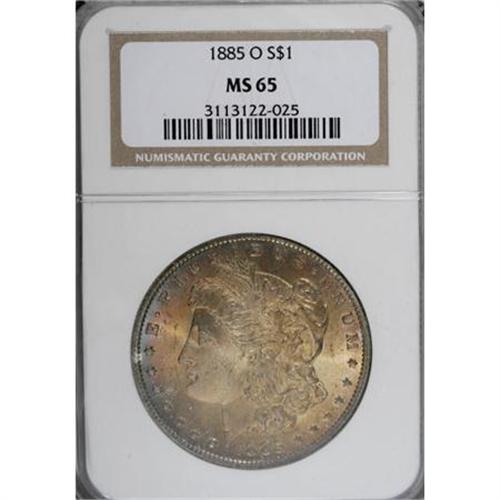 <B>1885-O $1 MS65 NGC.</B></I> NGC Census: (20700/3716). PCGS Population (14797/2044). Mintage: 9,185,000. Numismedia Wsl. Price for NGC/PCGS coin in MS65: $117. (#7162)<BR><BR><B>Coin Engraver:</B> George T. Morgan<BR><BR><b>Shipping:</b> Coins & Currency (<a target="_blank" href="http://www.heritageauctions.com/common/shipping.php">view shipping information</a>)