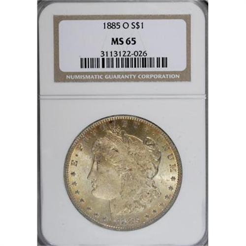 <B>1885-O $1 MS65 NGC.</B></I> NGC Census: (20700/3716). PCGS Population (14797/2044). Mintage: 9,185,000. Numismedia Wsl. Price for NGC/PCGS coin in MS65: $117. (#7162)<BR><BR><B>Coin Engraver:</B> George T. Morgan<BR><BR><b>Shipping:</b> Coins & Currency (<a target="_blank" href="http://www.heritageauctions.com/common/shipping.php">view shipping information</a>)