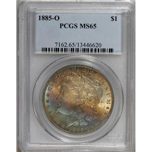 <B>1885-O $1 MS65 PCGS.</B></I> Waves of orange, violet, sky-blue, and gold adorn the obverse of this lustrous Gem. The reverse is bathed in aquamarine. The centers are typically defined for an O-mint of the era.<BR><BR><B>Coin Engraver:</B> George T. Morgan<BR><BR><b>Shipping:</b> Coins & Currency (<a target="_blank" href="http://www.heritageauctions.com/common/shipping.php">view shipping information</a>)