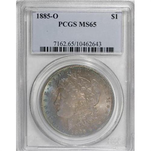 <B>1885-O $1 MS65 PCGS.</B></I> . PCGS Population (14896/2050). NGC Census: (21061/3764). Mintage: 9,185,000. Numismedia Wsl. Price for NGC/PCGS coin in MS65: $122. (#7162)<BR><BR><B>Coin Engraver:</B> George T. Morgan<BR><BR><b>Shipping:</b> Coins & Currency (<a target="_blank" href="http://www.heritageauctions.com/common/shipping.php">view shipping information</a>)