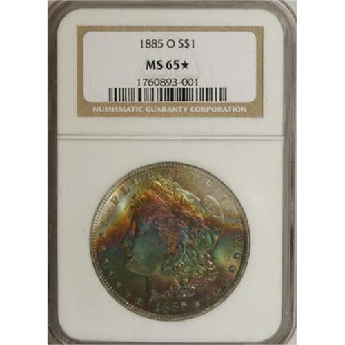 <B>1885-O $1 MS65 <img border='0' src='http://www.heritagecoins.com/images/star.gif' width=10 height=10> NGC.</B></I> The obverse is exuberantly toned in splashes of blue-green, radish-red, lemon, and powder-blue. The reverse is nearly untoned, and has a rim mark at 7:30.<BR><BR><B>Coin Engraver:</B> George T. Morgan<BR><BR><b>Shipping:</b> Coins & Currency (<a target="_blank" href="http://www.heritageauctions.com/common/shipping.php">view shipping information</a>)