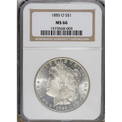 <B>1885-O $1 MS66 NGC.</B></I> NGC Census: (3248/400). PCGS Population (1873/124). Mintage: 9,185,000. Numismedia Wsl. Price: $250. (#7162)<BR><BR><b>Shipping:</b> Coins & Currency (<a target="_blank" href="http://www.heritageauctions.com/common/shipping.php">view shipping information</a>)