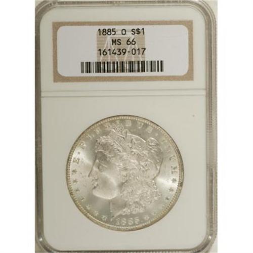 <B>1885-O $1 MS66 NGC.</B></I> NGC Census: (3275/401). PCGS Population (1866/126). Mintage: 9,185,000. Numismedia Wsl. Price for NGC/PCGS coin in MS66: $248. (#7162)<BR><BR><b>Shipping:</b> Coins & Currency (<a target="_blank" href="http://www.heritageauctions.com/common/shipping.php">view shipping information</a>)