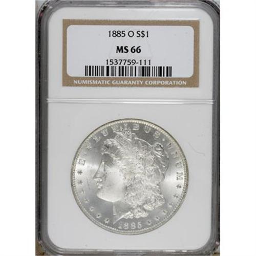 <B>1885-O $1 MS66 NGC.</B></I> NGC Census: (3290/401). PCGS Population (1866/126). Mintage: 9,185,000. Numismedia Wsl. Price for NGC/PCGS coin in MS66: $248. (#7162)<BR><BR><b>Shipping:</b> Coins & Currency (<a target="_blank" href="http://www.heritageauctions.com/common/shipping.php">view shipping information</a>)