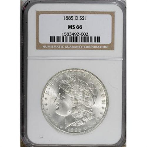 <B>1885-O $1 MS66 NGC.</B></I> NGC Census: (3304/402). PCGS Population (1889/127). Mintage: 9,185,000. Numismedia Wsl. Price for NGC/PCGS coin in MS66: $248. (#7162)<BR><BR><B>Coin Engraver:</B> George T. Morgan<BR><BR><b>Shipping:</b> Coins & Currency (<a target="_blank" href="http://www.heritageauctions.com/common/shipping.php">view shipping information</a>)