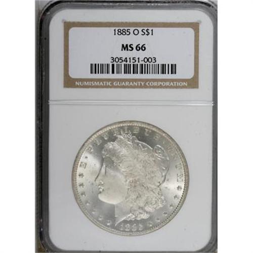 <B>1885-O $1 MS66 NGC.</B></I> NGC Census: (3313/403). PCGS Population (1913/127). Mintage: 9,185,000. Numismedia Wsl. Price for NGC/PCGS coin in MS66: $240. (#7162)<BR><BR><B>Coin Engraver:</B> George T. Morgan<BR><BR><b>Shipping:</b> Coins & Currency (<a target="_blank" href="http://www.heritageauctions.com/common/shipping.php">view shipping information</a>)