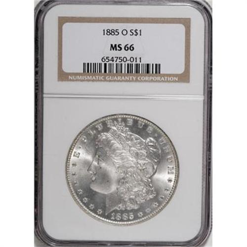 <B>1885-O $1 MS66 NGC.</B></I> NGC Census: (3351/408). PCGS Population (1917/128). Mintage: 9,185,000. Numismedia Wsl. Price for NGC/PCGS coin in MS66: $240. (#7162)<BR><BR><B>Coin Engraver:</B> George T. Morgan<BR><BR><b>Shipping:</b> Coins & Currency (<a target="_blank" href="http://www.heritageauctions.com/common/shipping.php">view shipping information</a>)