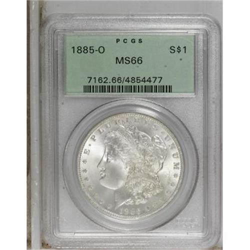 <B>1885-O $1 MS66 PCGS.</B></I> PCGS Population (1866/126). NGC Census: (3275/401). Mintage: 9,185,000. Numismedia Wsl. Price for NGC/PCGS coin in MS66: $248. (#7162)<BR><BR><b>Shipping:</b> Coins & Currency (<a target="_blank" href="http://www.heritageauctions.com/common/shipping.php">view shipping information</a>)