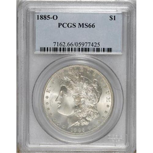 <B>1885-O $1 MS66 PCGS.</B></I> PCGS Population (1866/126). NGC Census: (3275/401). Mintage: 9,185,000. Numismedia Wsl. Price for NGC/PCGS coin in MS66: $248. (#7162)<BR><BR><b>Shipping:</b> Coins & Currency (<a target="_blank" href="http://www.heritageauctions.com/common/shipping.php">view shipping information</a>)