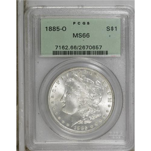 <B>1885-O $1 MS66 PCGS.</B></I> PCGS Population (1873/124). NGC Census: (3210/392). Mintage: 9,185,000. Numismedia Wsl. Price: $250. (#7162)<BR><BR><b>Shipping:</b> Coins & Currency (<a target="_blank" href="http://www.heritageauctions.com/common/shipping.php">view shipping information</a>)