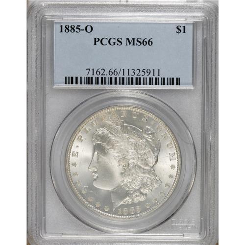 <B>1885-O $1 MS66 PCGS.</B></I> PCGS Population (1873/124). NGC Census: (3226/392). Mintage: 9,185,000. Numismedia Wsl. Price: $250. (#7162)<BR><BR><b>Shipping:</b> Coins & Currency (<a target="_blank" href="http://www.heritageauctions.com/common/shipping.php">view shipping information</a>)