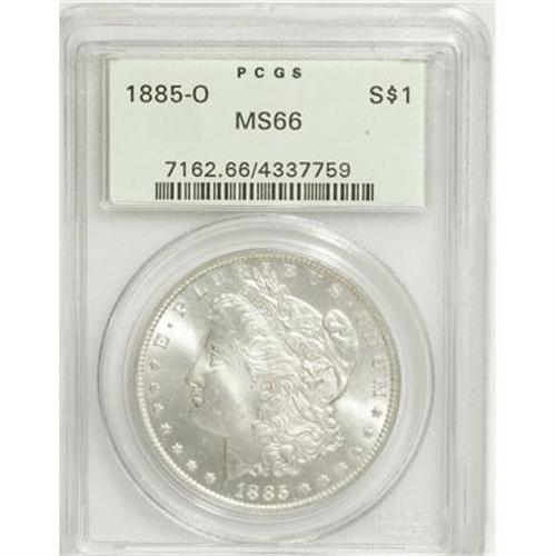 <B>1885-O $1 MS66 PCGS.</B></I> PCGS Population (1906/127). NGC Census: (3313/403). Mintage: 9,185,000. Numismedia Wsl. Price for NGC/PCGS coin in MS66: $240. (#7162)<BR><BR><B>Coin Engraver:</B> George T. Morgan<BR><BR><b>Shipping:</b> Coins & Currency (<a target="_blank" href="http://www.heritageauctions.com/common/shipping.php">view shipping information</a>)