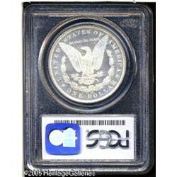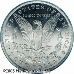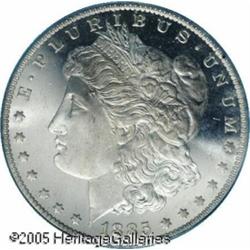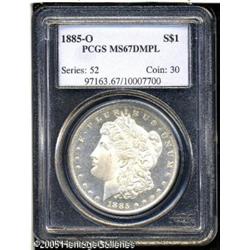 <B>1885-O<img border='0' src='http://www.heritagecoins.com/images/star.gif' width=10 height=10>$1 MS67 Deep Mirror Prooflike PCGS.</B></I> During the early 1960s, countless bags of 1885-O Morgan dollars were released from the Treasury, and today, Mint State examples are plentiful, being among the most common of all Morgan silver dollar issues. However, most are at the lower levels of Mint State, and nearly all fall short of the Gem grade level. Few of those coins that were released had nicely contrasting prooflike surfaces. The survival of such coins was purely a matter of chance. Now, 120 years after these coins were struck, this example is the single finest dollar of the issue with deep mirrored surfaces and full contrast. The surfaces are fully brilliant with silvery-white color and no trace of toning. The fields are deeply mirrored, and the devices have fully frosty luster. A Superb Gem of amazing quality, the ultimate '85-O Morgan dollar. Population: 1 in 67, 0 finer (1/05).<BR><I>From The Dr. Volker Dube Collection.</B></I> Lot:7238