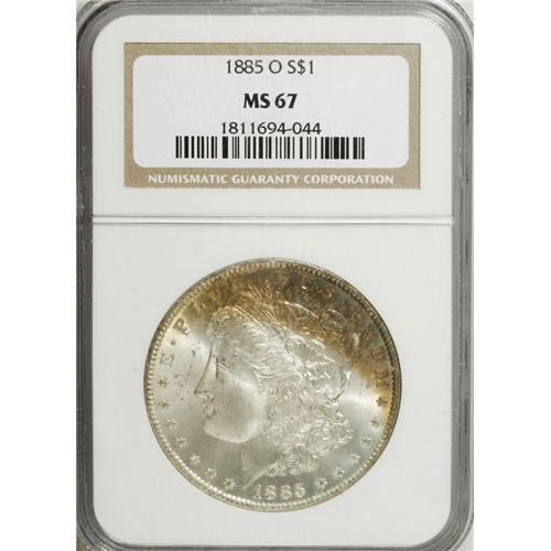 <B>1885-O $1 MS67 NGC.</B></I> NGC Census: (391/9). PCGS Population (0/0). Mintage: 9,185,000. Numismedia Wsl. Price for NGC/PCGS coin in MS67: $1,300. (#7162)<BR><BR><b>Shipping:</b> Coins & Currency (<a target="_blank" href="http://www.heritageauctions.com/common/shipping.php">view shipping information</a>)