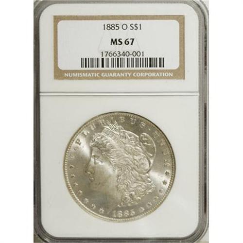 <B>1885-O $1 MS67 NGC.</B></I> Traces of tan patina grace this sharply struck and highly lustrous Superb Gem. A well preserved example of this collectible New Orleans issue. NGC has certified only 9 pieces in higher grades (6/07).<BR><I>From the Reuben Reinstein Collection.</B></I><BR><BR><b>Shipping:</b> Coins & Currency (<a target="_blank" href="http://www.heritageauctions.com/common/shipping.php">view shipping information</a>)