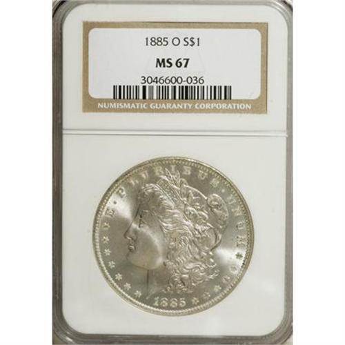 <B>1885-O $1 MS67 NGC.</B></I> Intense frosty mint luster radiates from the bright, snow-white surfaces of this Superb Morgan dollar. The design elements are well struck, except for a flat area just above Liberty's ear. Surface marks are nearly nonexistent. <BR><BR><b>Shipping:</b> Coins & Currency (<a target="_blank" href="http://www.heritageauctions.com/common/shipping.php">view shipping information</a>)