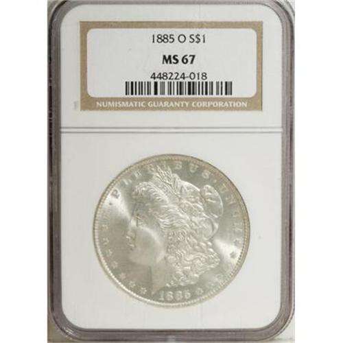 <B>1885-O $1 MS67 NGC.</B></I> Pleasingly detailed with creamy luster, though even this better-defined O-mint representative shows a touch of softness at the hair above the ear. Exquisitely preserved with excellent visual appeal. NGC has graded only nine finer examples, while PCGS has certified no such pieces (10/07).<BR><BR><B>Coin Engraver:</B> George T. Morgan<BR><BR><b>Shipping:</b> Coins & Currency (<a target="_blank" href="http://www.heritageauctions.com/common/shipping.php">view shipping information</a>)