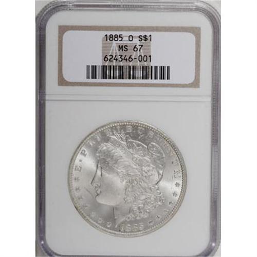 <B>1885-O $1 MS67 NGC.</B></I> The 1885-O ends a three-year run of readily available New Orleans issues. This boldly struck Superb Gem has dazzling luster and infrequent hints of tan toning.<BR><BR><B>Coin Engraver:</B> George T. Morgan<BR><BR><b>Shipping:</b> Coins & Currency (<a target="_blank" href="http://www.heritageauctions.com/common/shipping.php">view shipping information</a>)