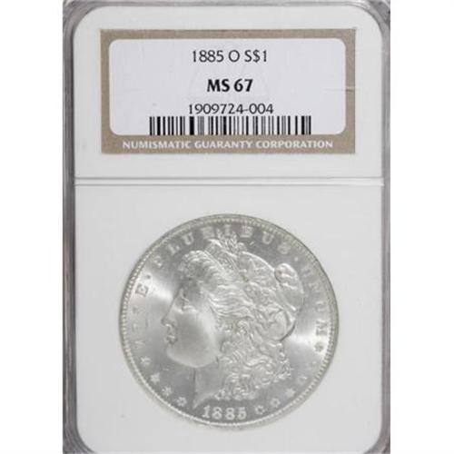 <B>1885-O $1 MS67 NGC.</B></I> Highly lustrous surfaces are well cared for and display adequately struck devices for a New Orleans Mint issue. A hint or two of light tan shows up under magnification.<BR><BR><B>Coin Engraver:</B> George T. Morgan<BR><BR><b>Shipping:</b> Coins & Currency (<a target="_blank" href="http://www.heritageauctions.com/common/shipping.php">view shipping information</a>)