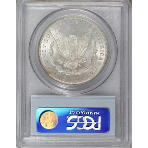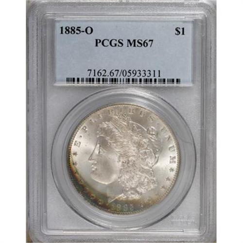 <B>1885-O $1 MS67 PCGS.</B></I> A frosty and essentially untoned New Orleans Superb Gem, untoned save for thin bands of aqua, gold, magenta, and blue-green at the lower left obverse. A delightful example of this early issue, more elusive in the highest grades than its mintage of over 9.1 million pieces might suggest. Tied for the finest certified by PCGS (5/07).<BR><BR><b>Shipping:</b> Coins & Currency (<a target="_blank" href="http://www.heritageauctions.com/common/shipping.php">view shipping information</a>)