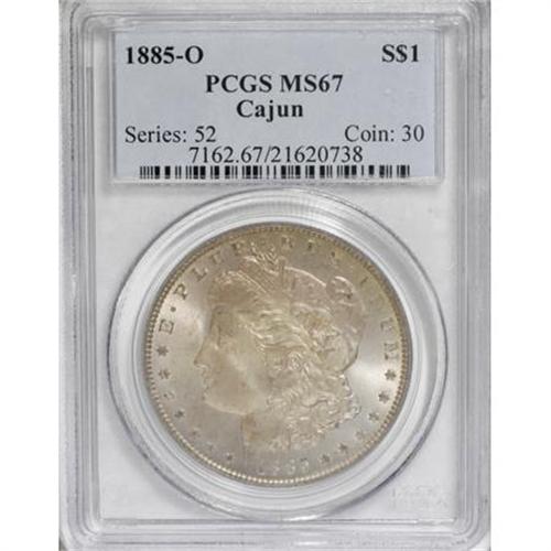<B>1885-O $1 MS67 PCGS.</B></I> <B>1885-O S$1 MS67 PCGS.</B></I> Ex: Cajun. Dusky honey-gold toning is evenly distributed across this lustrous and splendidly preserved Superb Gem. Crisply struck for an O-mint of this era. PCGS has yet to certify an example above the MS67 grade (7/07).<BR><BR><B>Coin Engraver:</B> George T. Morgan<BR><BR><b>Shipping:</b> Coins & Currency (<a target="_blank" href="http://www.heritageauctions.com/common/shipping.php">view shipping information</a>\)