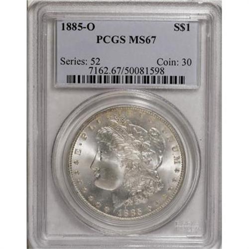 <B>1885-O $1 MS67 PCGS.</B></I> Pleasingly detailed with shining luster and excellent eye appeal for this New Orleans issue. A beautifully preserved olive-accented Superb Gem that is tied for the finest certified by PCGS (1/08).<BR><I>From The Jimmy G. PCGS Registry Collection of Morgan Dollars with Varieties.</B></I><BR><BR><B>Coin Engraver:</B> George T. Morgan<BR><BR><b>Shipping:</b> Coins & Currency (<a target="_blank" href="http://www.heritageauctions.com/common/shipping.php">view shipping information</a>)