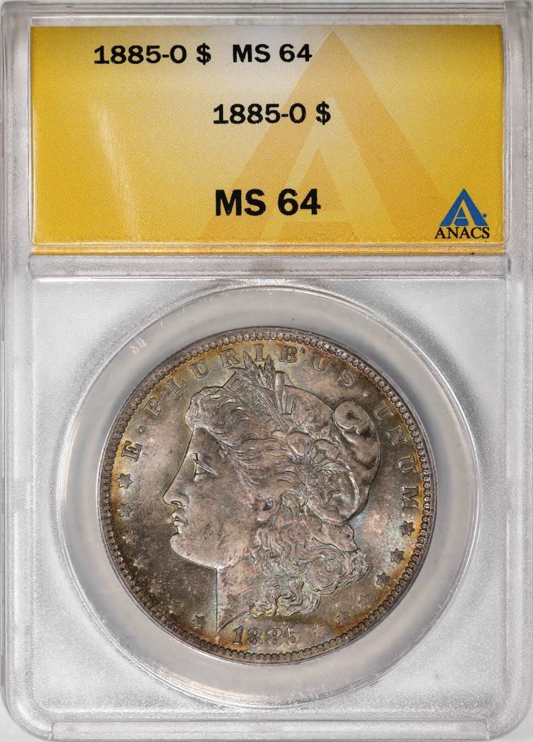 One 1885-O $1 Morgan Silver Dollar Coin ANACS MS64 Amazing Toning. ANACS Certified.