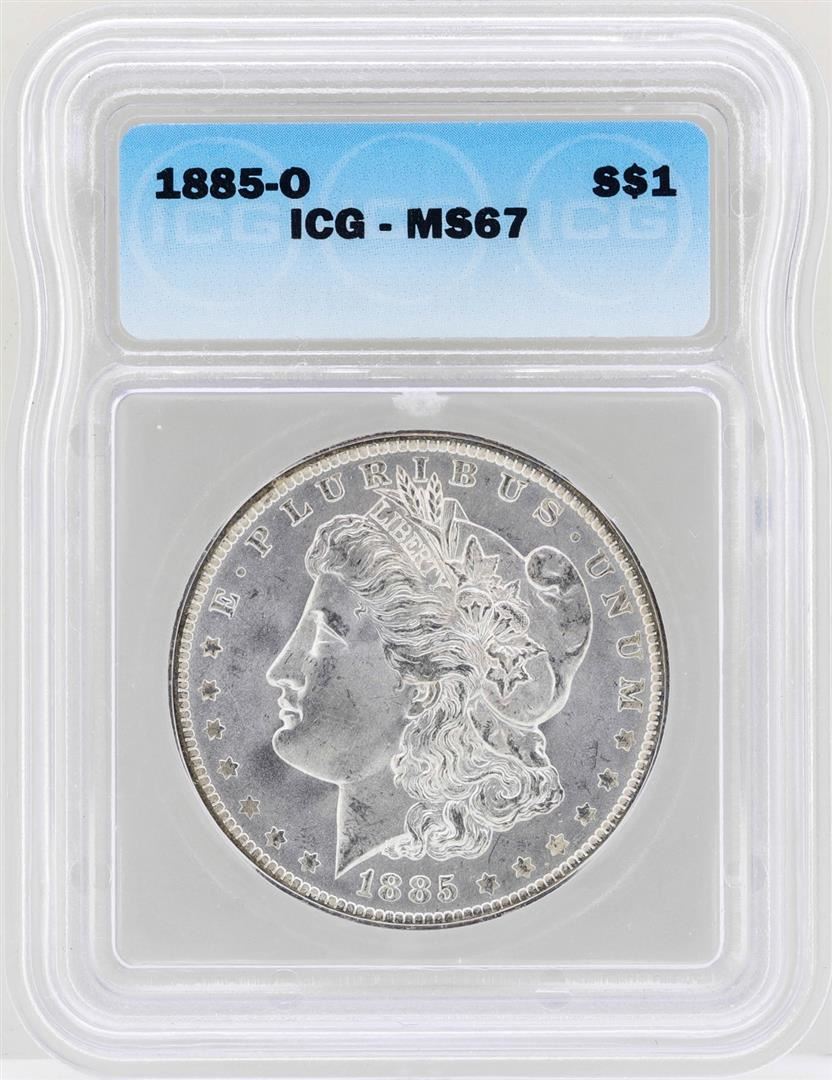 One 1885-O $1 Morgan Silver Dollar Coin ICG MS67. ICG Certified.