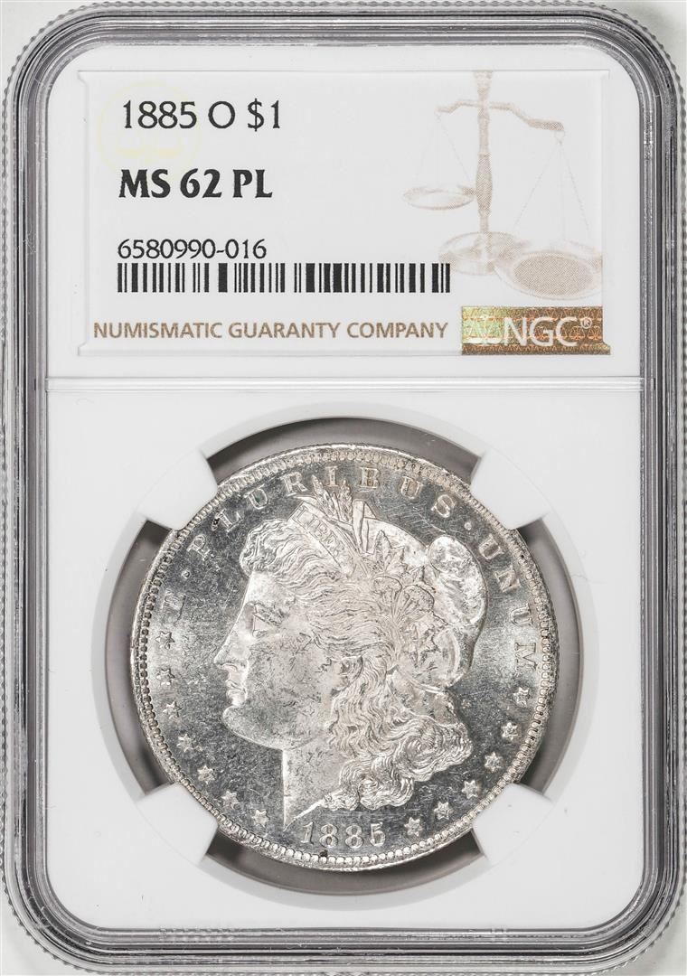 One 1885-O $1 Morgan Silver Dollar Coin NGC MS62PL. NGC Certified.