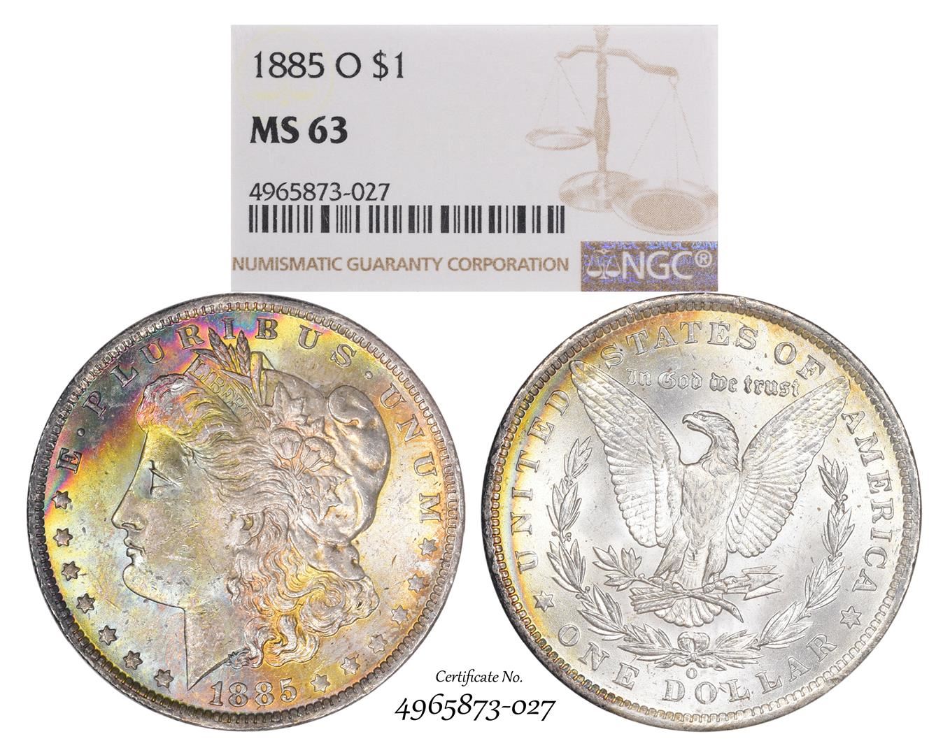 One 1885-O $1 Morgan Silver Dollar Coin NGC MS63 Amazing Toning. NGC Certified.