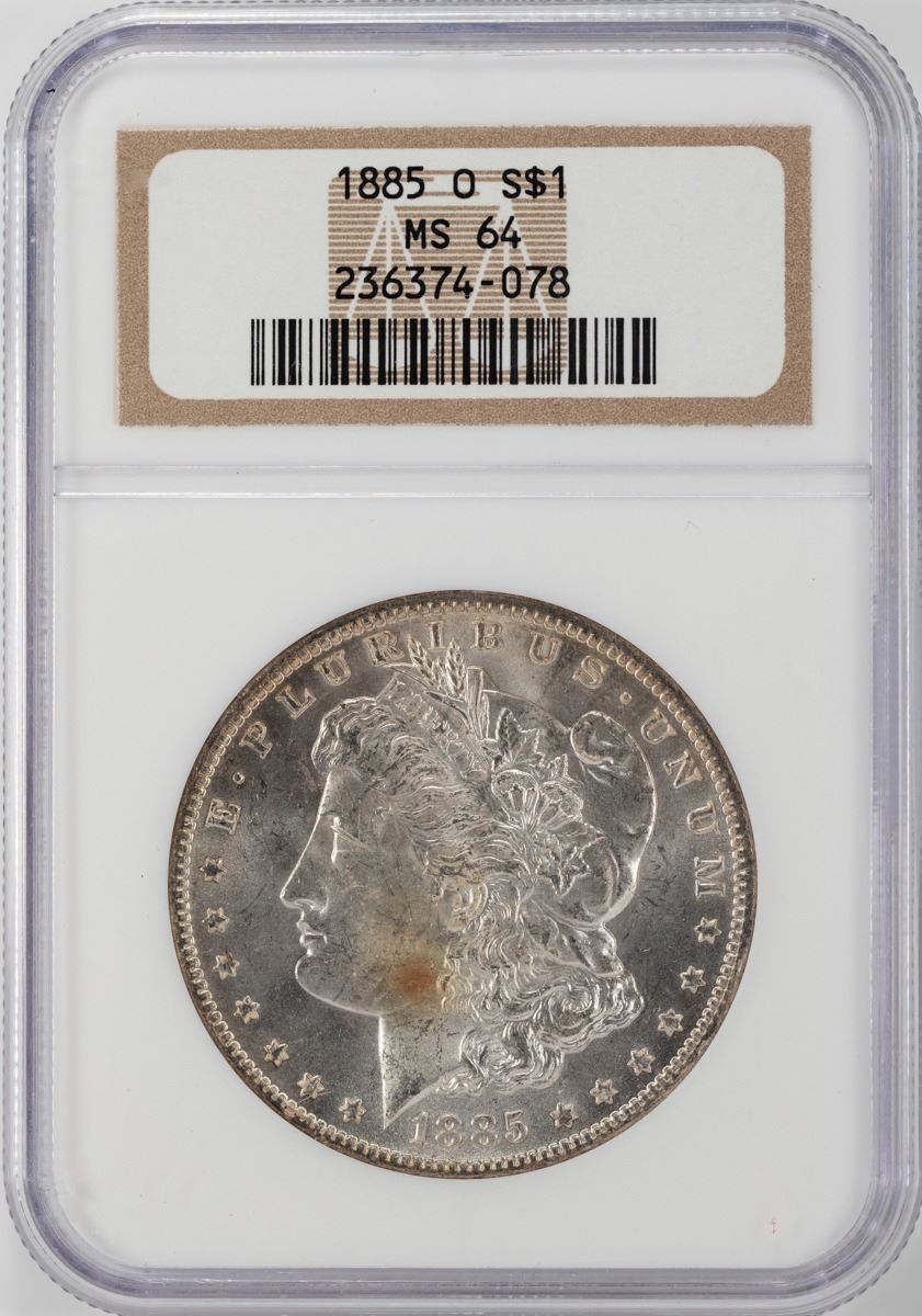 One 1885-O $1 Morgan Silver Dollar Coin NGC MS64.