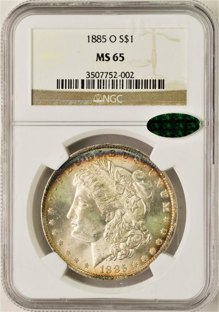 One 1885-O $1 Morgan Silver Dollar Coin NGC MS65 CAC Amazing Toning. NGC Certified.