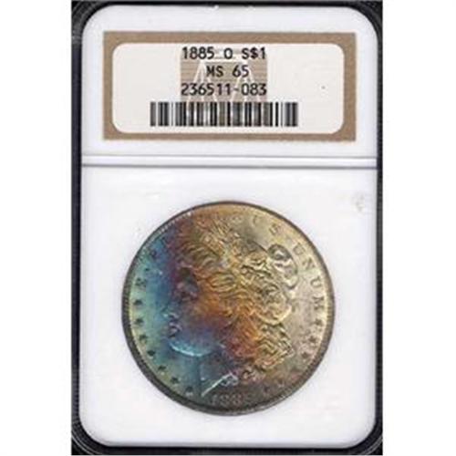 Here, too, we are pleased to see a coin whose gem quality luster supports eye-catching multicolor toning in several bands across the obverse. Gold, orange, sky blue, the effect is almost too much for words.