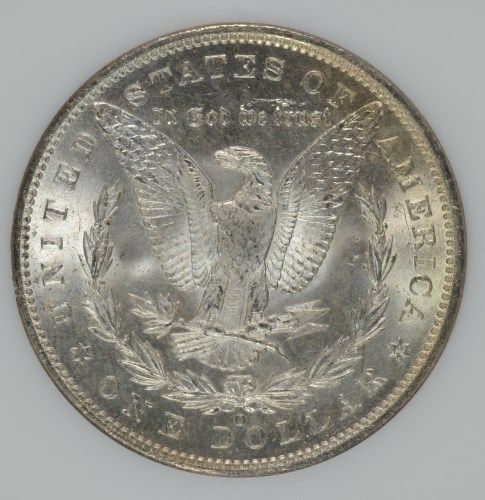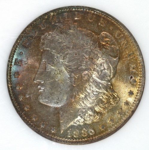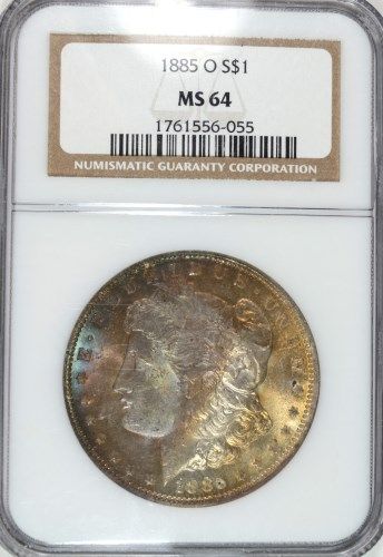 1885-O MORGAN SILVER DOLLAR, NGC MS-64 RAINBOW COLORS