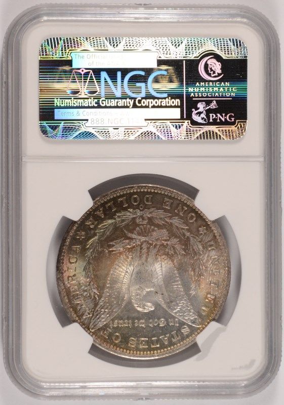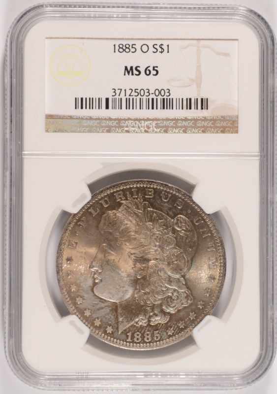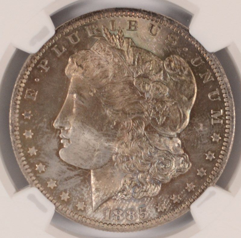 1885-O MORGAN SILVER DOLLAR, NGC MS-65 GEM PRETTY BLUES, PINKS AND GOLD
