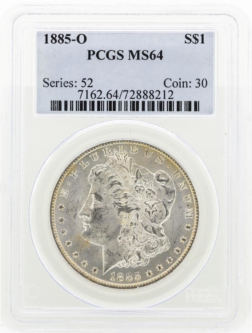One 1885-O MS64 Morgan Silver Dollar.