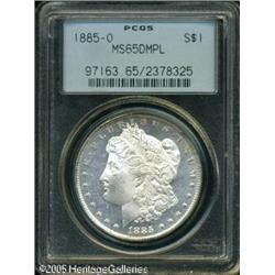 <B>1885-O<img border='0' src='http://www.heritagecoins.com/images/star.gif' width=10 height=10>$1 MS65 Deep Mirror Prooflike PCGS.</B></I> Wisps of tan patina are seen on Liberty's cheek and the eagle's breast. Nice field to devices contrast. Lot:10210