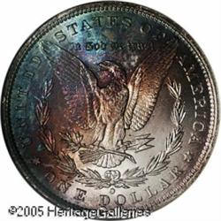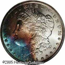 <B>1885-O<img border='0' src='http://www.heritagecoins.com/images/star.gif' width=10 height=10>$1 MS68 NGC.</B></I> The 1885-O Dollar is one of the most common dates in the Morgan series up to the MS66 level. However, the story changes drastically in grades above that. This is an absolutely pristine, colorfully toned specimen with ultra frosty surfaces. Fully struck, the fields and devices require light magnification to verify <I>any</B></I> coin-to-coin contact. Each side is further enhanced with partial area of rich brick-red, gold, and electric-blue toning. A rare opportunity for the perfectionist. Population: 8 in 68, 0 finer (1/05). Lot:10209